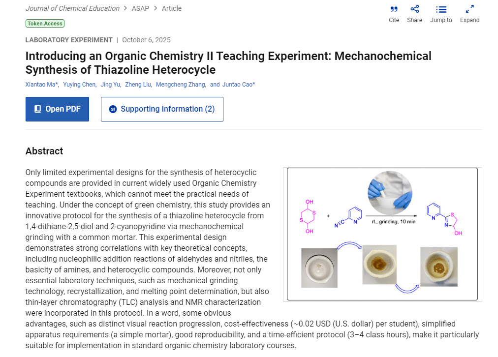 近日,m88官网马献涛博士、曹俊涛教授团队在化学教育国际顶级期刊 Journal of Chemical Education 发表了题为"Introducing an Organic Chemistry II Teaching Experiment: Mechanochemical Synthesis of Thiazoline Heterocycle"(J. Chem. Educ. 2025,DOI: 10.1021/acs.jchemed.5c00768)的最新教研成果。这是该教研团队自2024年以我校为第一单位首次在该期刊发表教研论文(J. Chem. Educ. 2024, 101, 2493−2497)之后的又一重要成果。