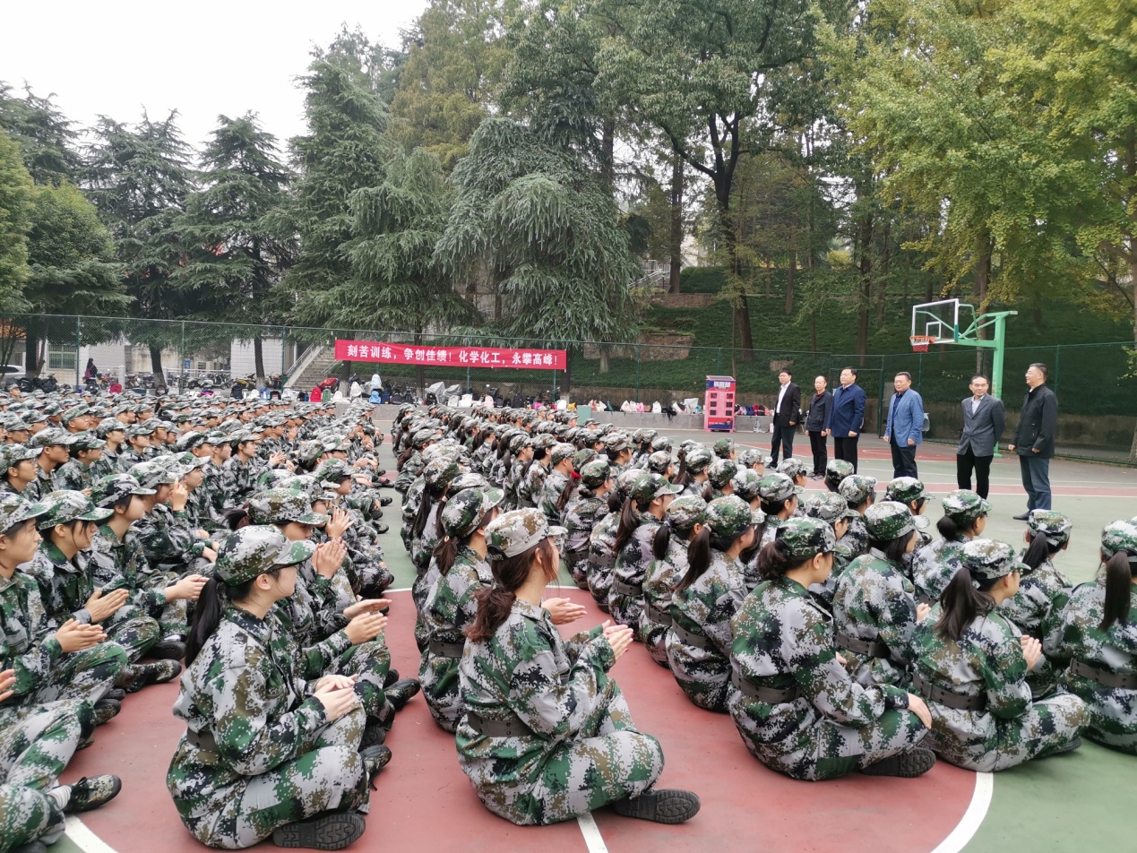 随后,郭鹏、井强山一行慰问在场的军训新生。在耐心询问了同学们的军训情况后,郭鹏代表党政班子慰问团成员作了简短讲话。他告诉同学们,“军训是大员工接受锻炼、提高自身综合素质、展现自我的一个平台”,鼓励同学们将军训的磨砺内化成努力奋斗、更上层楼的不竭动力,为今后的学习生活奠定坚实基础。要用心、用情、用力大声喊出:“厚德崇实、善学敏行”“化学化工、勇攀高峰”“化学化工、谁与争锋”的响亮口号。