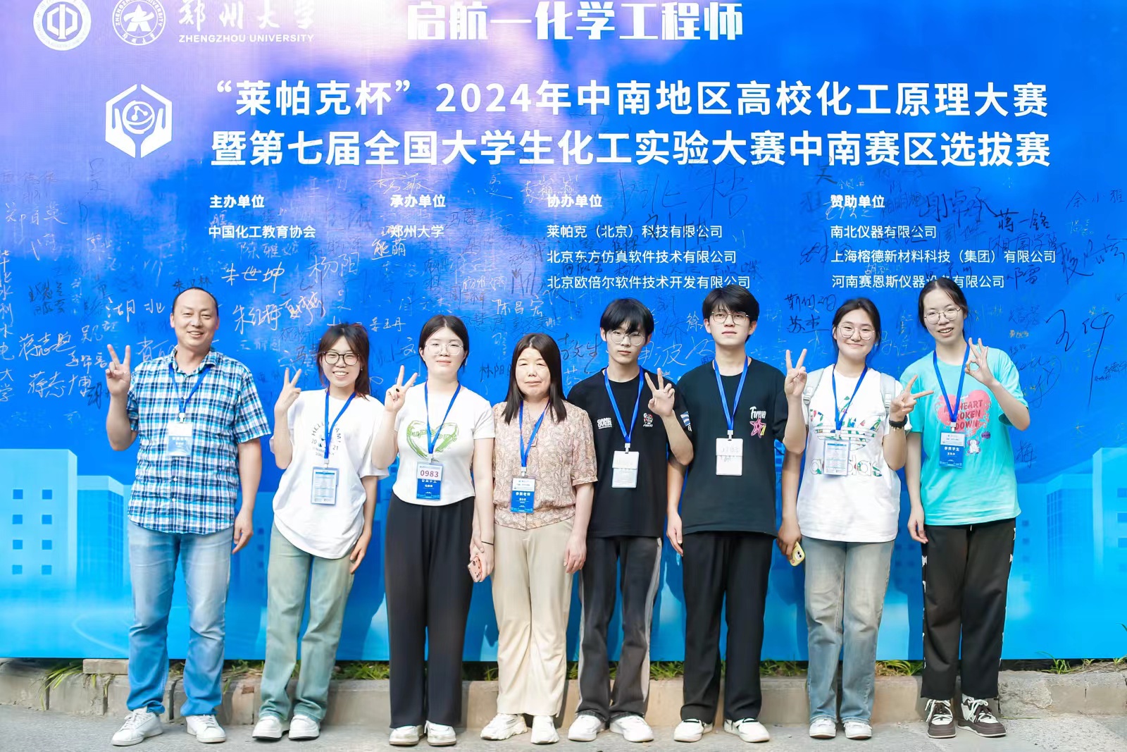 7月11至7月14日,由中国化工教育协会主办的“莱帕克杯”2024年中南地区高校化工原理大赛暨第七届全国大员工化工实验大赛中南赛区选拔赛在郑州大学举行,m88官网2021级材料化学和应用化学专业本科生邱佳晴、王恩赐、马静琪组成的“东湖”队和范雨晴、王珍卉、王召洋组成的“南湖”队参加了本次比赛。经过2天紧张而激烈的比赛,“南湖”队和“东湖”队分别荣获中南赛区一等奖和二等奖。