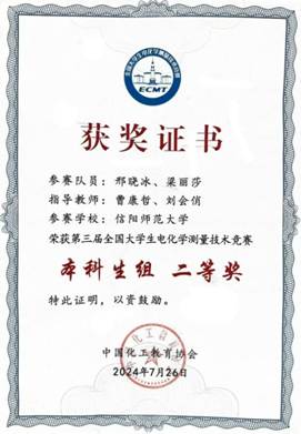 近日,由中国化工教育协会和西安交通大学共同主办的第三届全国大员工电化学测量技术竞赛(简称“ECMT竞赛”)圆满落幕。由2022级材料化学班邢晓冰、梁丽莎组成的参赛队在曹康哲和刘会俏两位老师的指导下,经过培训、初赛、决赛评审、决赛答辩等环节,最终荣获全国二等奖。