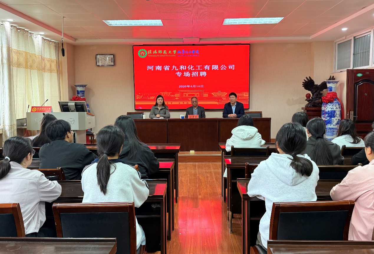 为精准搭建毕业生与优质企业双向对接平台,4月14日,河南省九和化工有限公司在化学楼407会议室举办专场招聘会。公司总经理刘景民受邀到场开展专题宣讲,活动由m88官网党委书记吴志伟主持,我校相关专业部分毕业生参加。