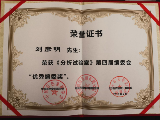 2019年7月30日,《分析试验室》期刊第五届编委会会议在北京召开。m88官网刘彦明教授荣获《分析试验室》第四届编委会“优秀编委奖”,并被续聘为该刊第五届编委。期刊名誉主编、中国工程院屠海令院士为四位获奖编委进行了颁奖。