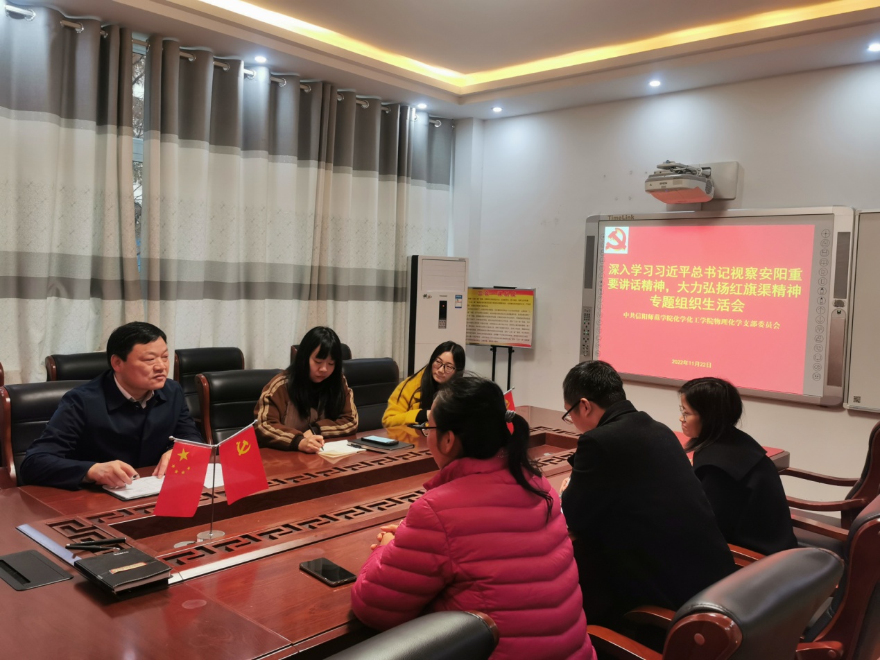 11月22日下午,物理化学党支部在化学楼党员之家召开“深入学习习近平总书记视察安阳重要讲话精神,大力弘扬红旗渠精神”专题组织生活会。m88官网党委书记郭鹏参加所属党支部组织生活会并作指导,支部全体党员参加了专题组织生活会。会议由物理化学支部书记常雪萍主持。